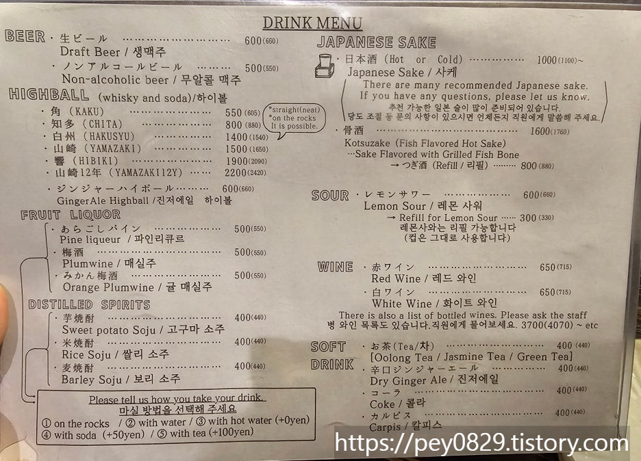 저는 히비키하이볼(2090엔), 남편은 사케를 주문했습니다. 직원분한테 추천해달라고 했더니 Arikatou junmai를 추천해주셨습니다(990엔).
