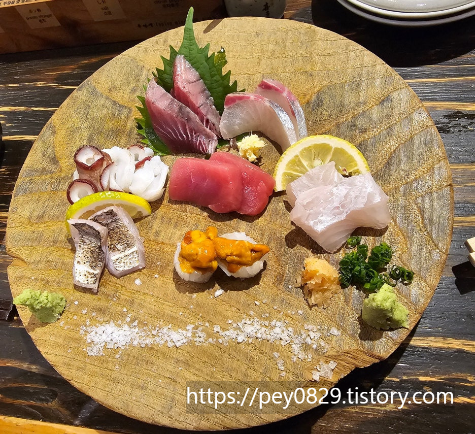 다음은 모둠회(3300엔) 입니다! 오징어+성게알, 가다랑어, 참치 등이 나옵니다.